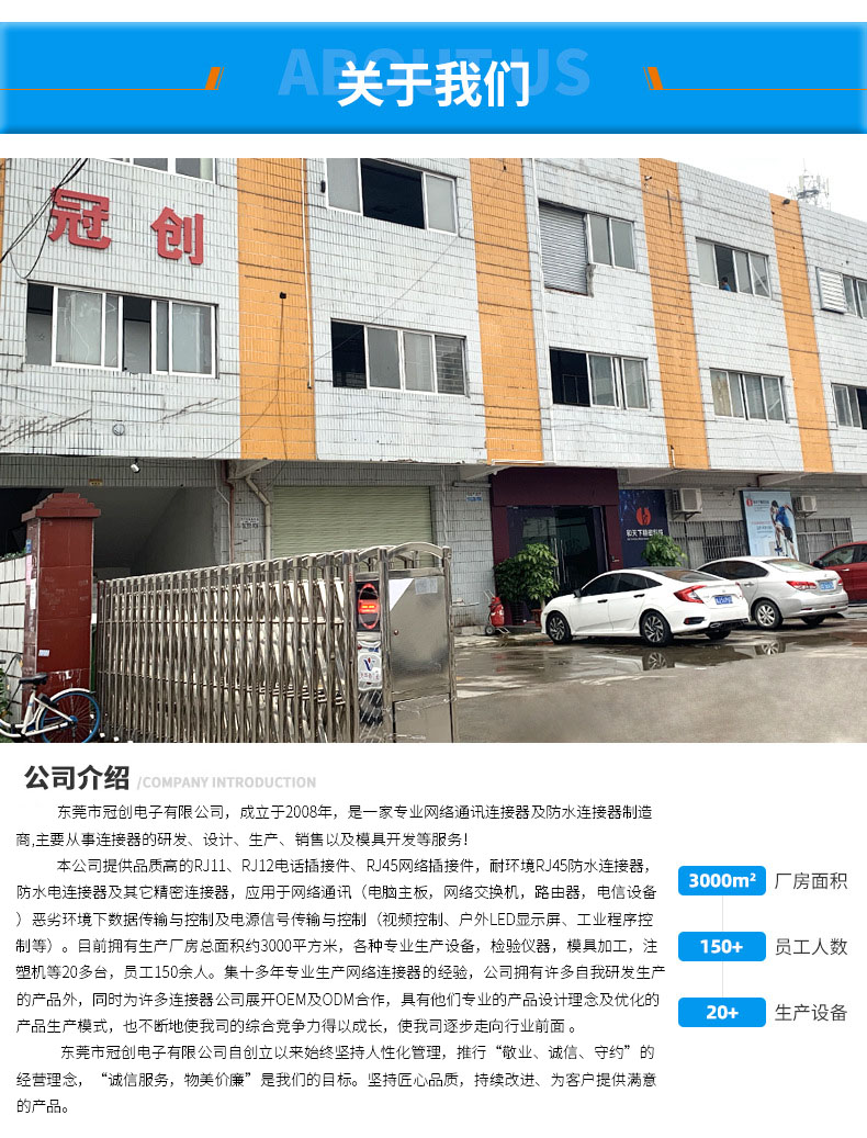 本公司提供優(yōu)良的RJ11、RJ12電話插接件、RJ45網(wǎng)絡(luò)插接件,耐環(huán)境RJ45防水連接器,防水電連接器及其它精密連接器,產(chǎn)品應(yīng)用于網(wǎng)絡(luò)通訊(電腦主板,網(wǎng)絡(luò)交換機(jī),路由器,電信設(shè)備)、惡劣環(huán)境下數(shù)據(jù)傳輸與控制及電源信號(hào)傳輸與控制(戶外LED顯示屏、機(jī)器控制、工業(yè)程序控制等)